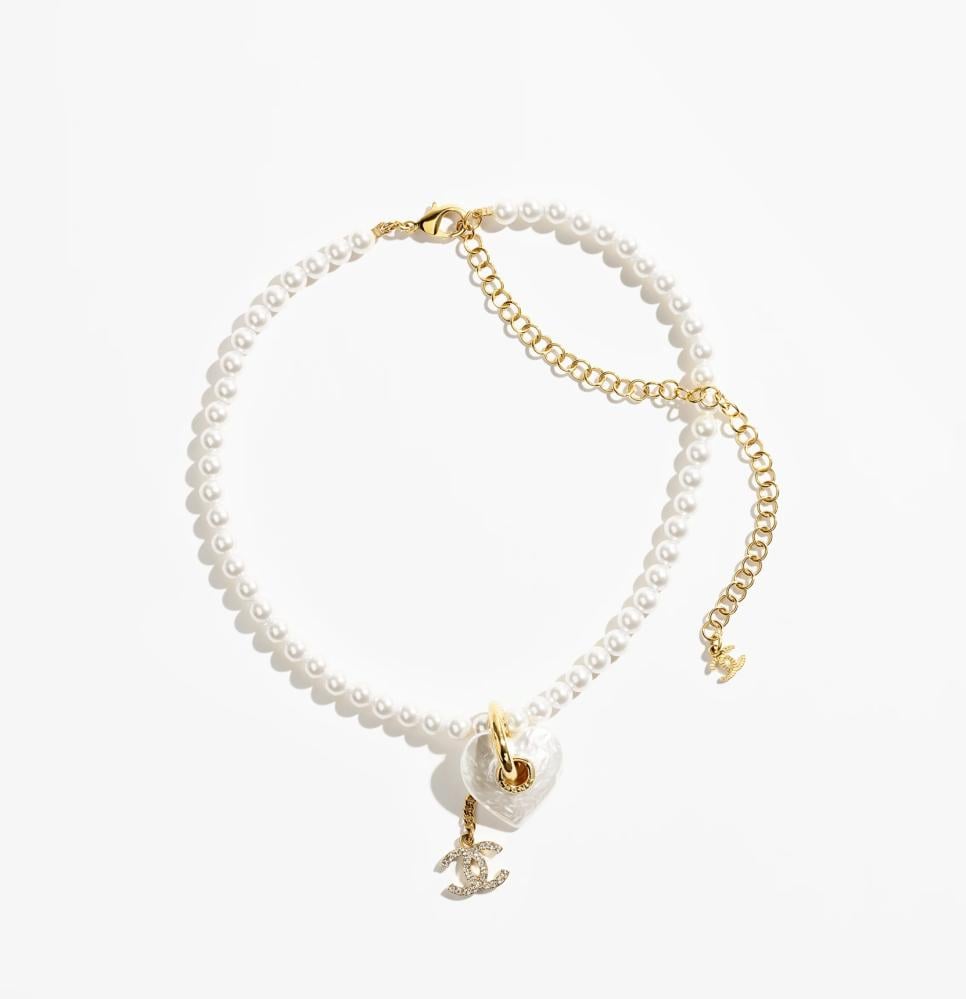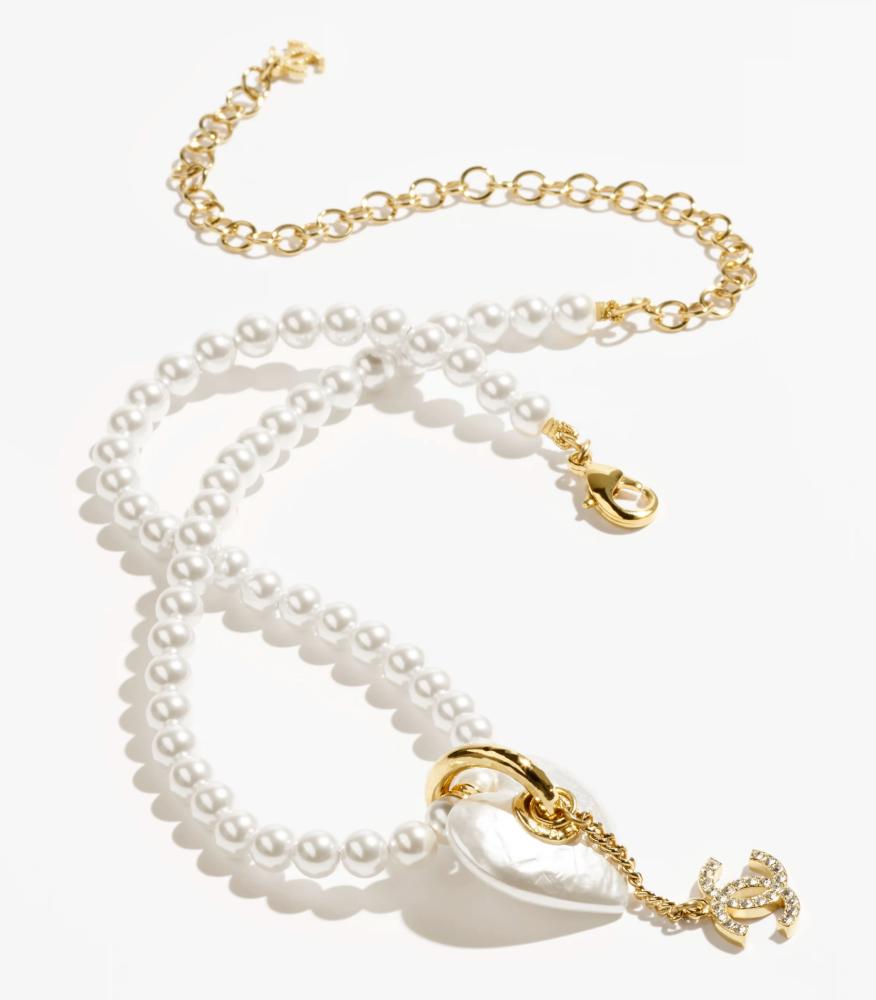 سلسلة لؤلؤية فريدة تجمع الأناقة والعصرية بتصميم متميز مستوحى من شعار ماركة شانيل المرصع بالكريستال الفاخر و المتدلي من قلب لؤلؤي مخروط خلاب. تمثل هذه السلسلة إضافة أنيقة إلى خزانتك لتعكس رقي ذوقك واختياراتك. بإمكانك أن تطبقي معها أقراط شانيل المماثلة لحضور السهرات و المناسبات الليلية.