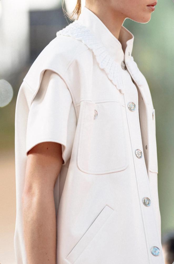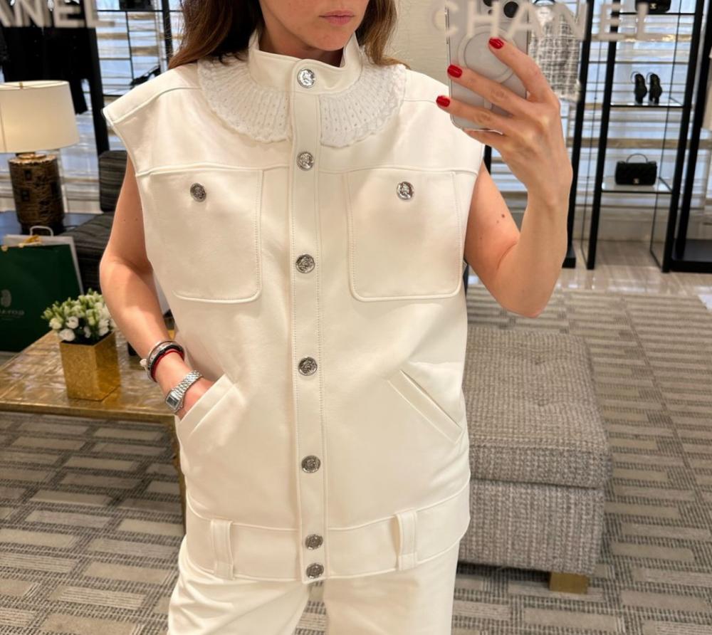 The Chanel Vest in White Leather combines elegance and luxury, showcasing the brand’s impeccable craftsmanship. Made from soft leather, this vest offers both comfort and sophistication. The white color enhances its versatility, making it an essential piece that can transition seamlessly from daytime to evening wear. With its sleek fit and timeless appeal, this Chanel vest is a statement of refined style and elevated fashion.