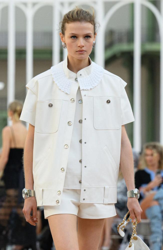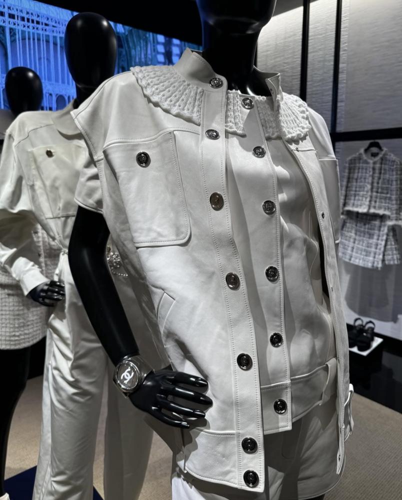 إنّ جيليه شانيل من الجلد الأبيض يجمع بين الأناقة و الرقي، مما يُظهر براعة العلامة التجارية التي لا تشوبها شائبة. مصنوع من الجلد الناعم. يقدم هذا الجيليه كلا من الراحة و الفخامة معا. ابيض اللون يعزز ذلك تعدد استخداماته مما يجعله قطعة أساسية يمكن أن تنتقل بسلاسة من النهار إلى ملابس السهرة بفضل ملاءمتها الأنيقة. ان هذا الجيليه من شانيل عبارة عن قطعة صممت للأناقة الراقية و الأزياء الفارهة.