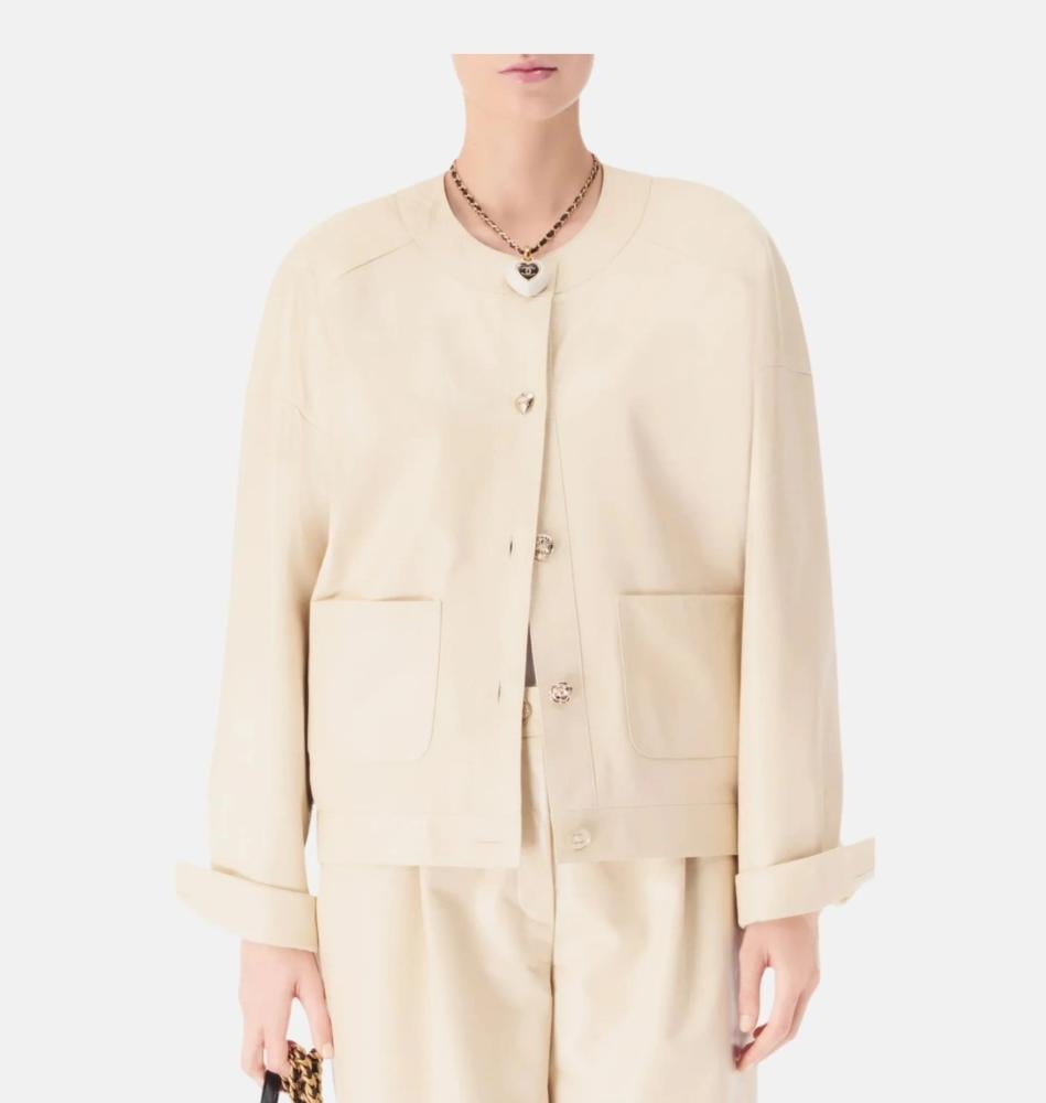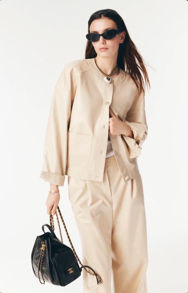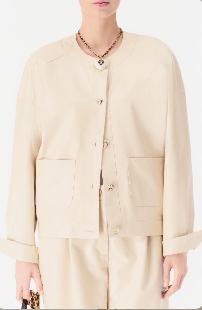 The Chanel Jacket in Leather is a refined outerwear statement that captures the essence of elevated minimalism. Presented in a timeless beige tone, this piece blends iconic Chanel tailoring with the supple elegance of genuine leather . Its structured yet soft silhouette delivers modern polish with an unmistakable luxurious touch.
