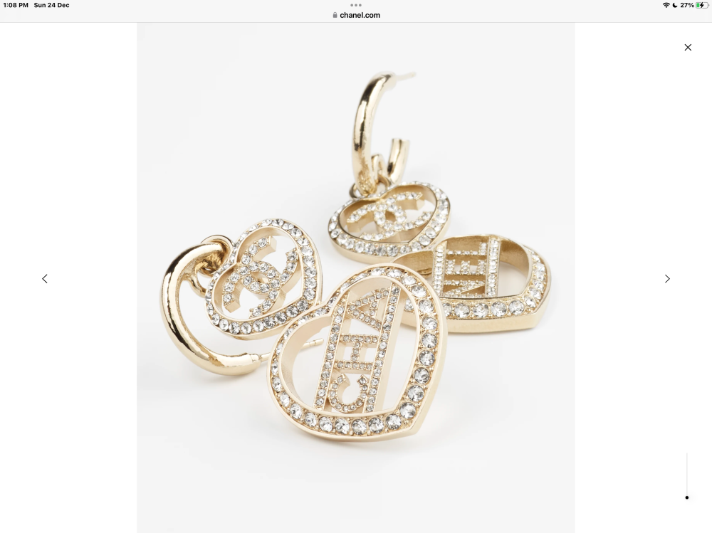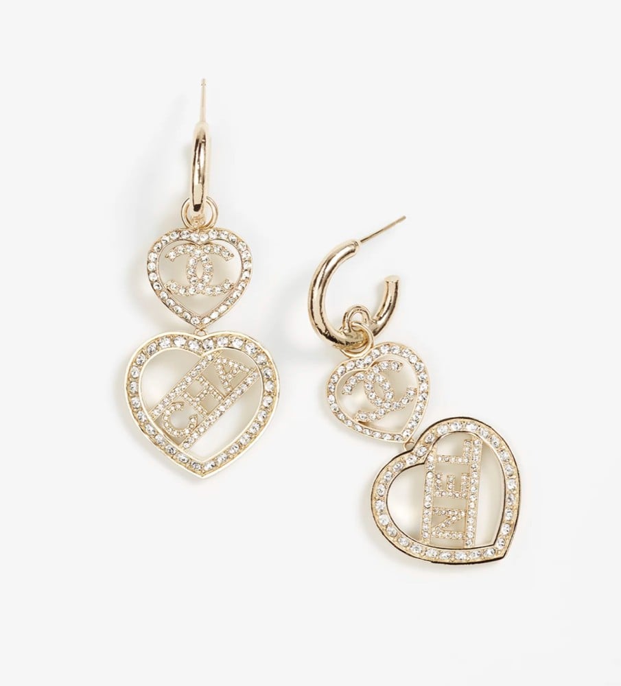 2024 Chanel very luxurious metal pendant earrings with two integrated hearts studded with hundreds of crystals, crystal gold with the CC logo and Chanel letters studded with luxurious crystals